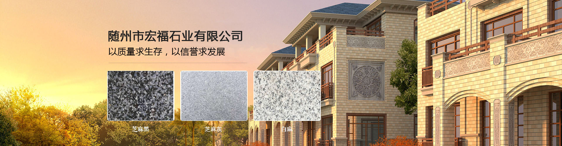 隨州市宏福石業有限公司地處湖北省隨州市,漢十高速公路直通武漢,交通十分便利,是一家集石材加工、銷售,國際貿易為一體的大型石材企業,本公司專業生產湖北黃金麻,白麻,芝麻灰,芝麻黑,卡基諾金,黃金鉆,咖啡鉆,黃金鉆花崗巖石材,花形均有大花,中花,小花品種;可加工生產磨光面,荔枝面,火燒面,噴沙面,自然面等。隨州花崗巖石材具有“質地硬,花點小,雜質少,顏色深,光度好,色差小”等優點,廣泛用于外墻干掛,路政廣場公園地鋪,家居裝修,墓園碑料。
